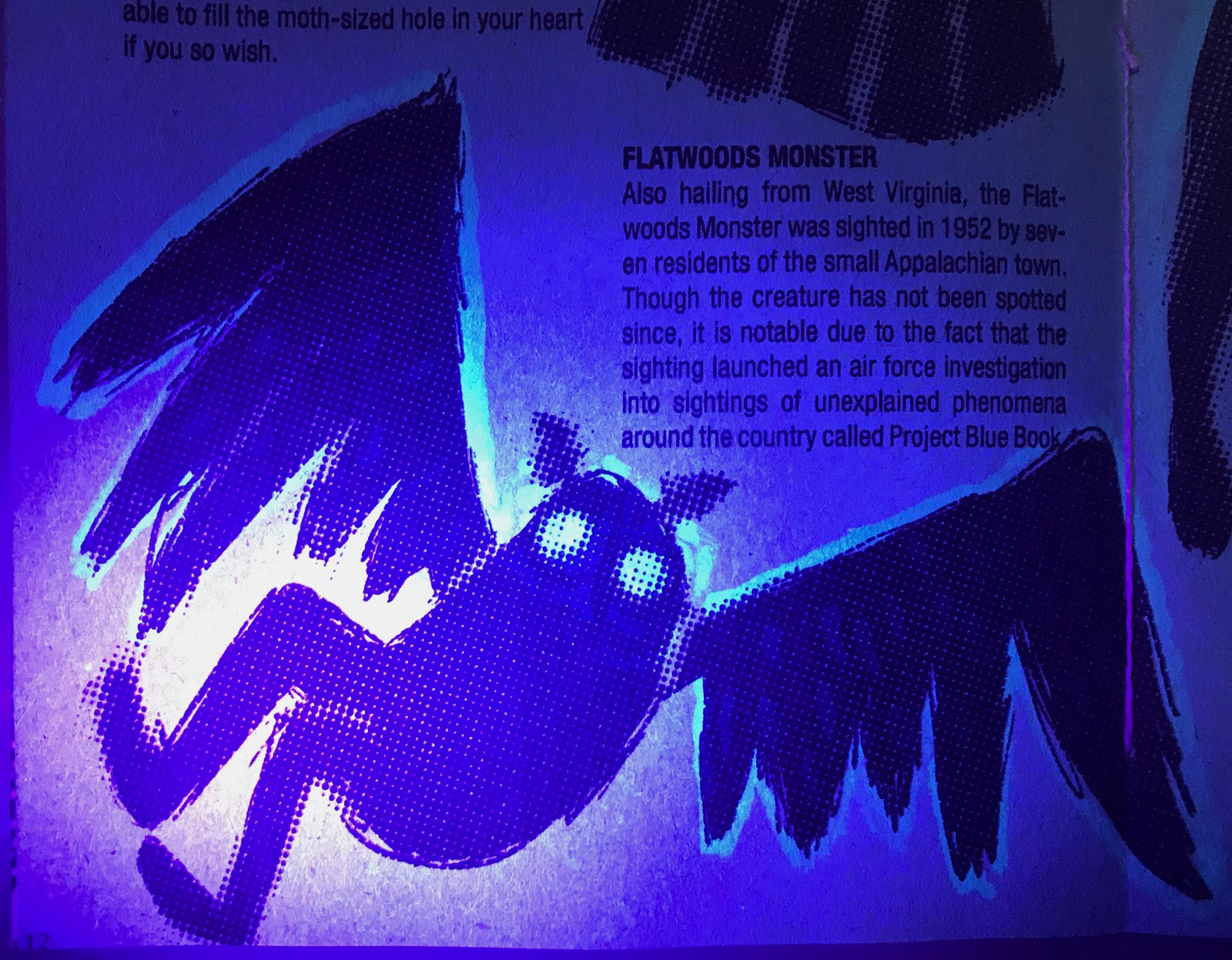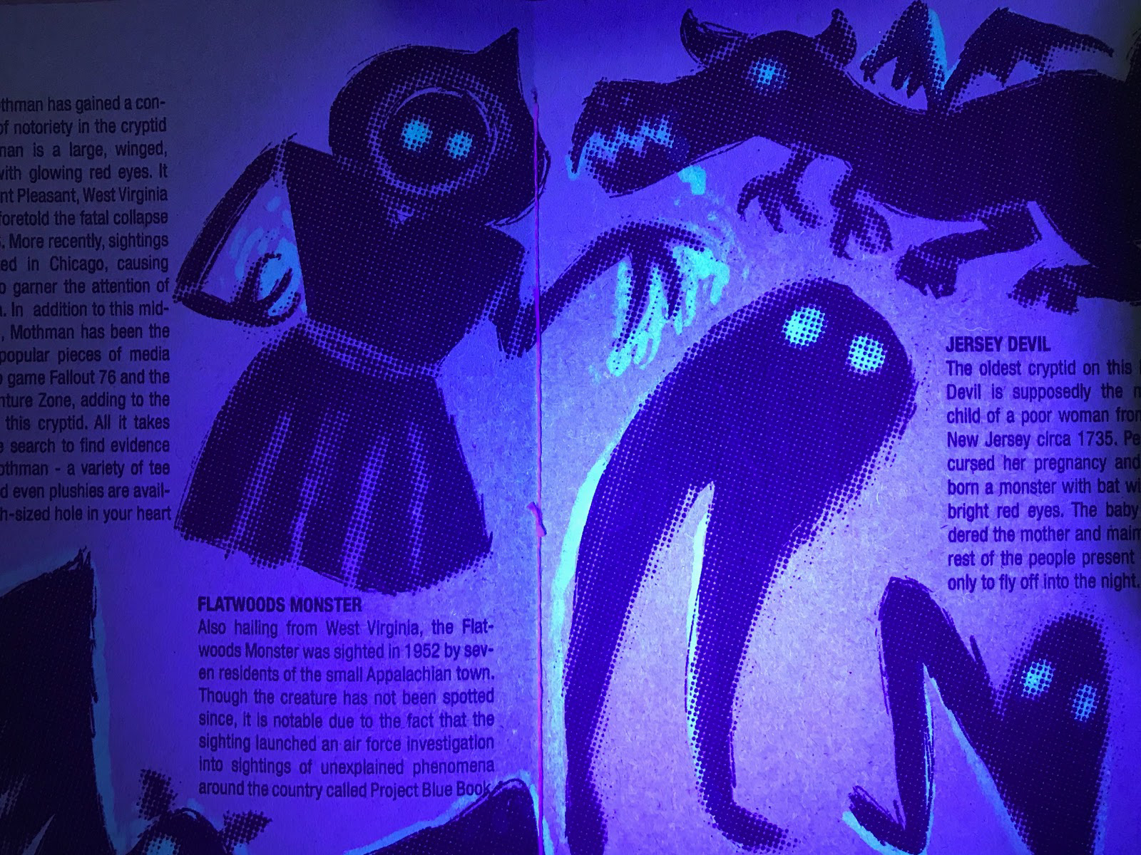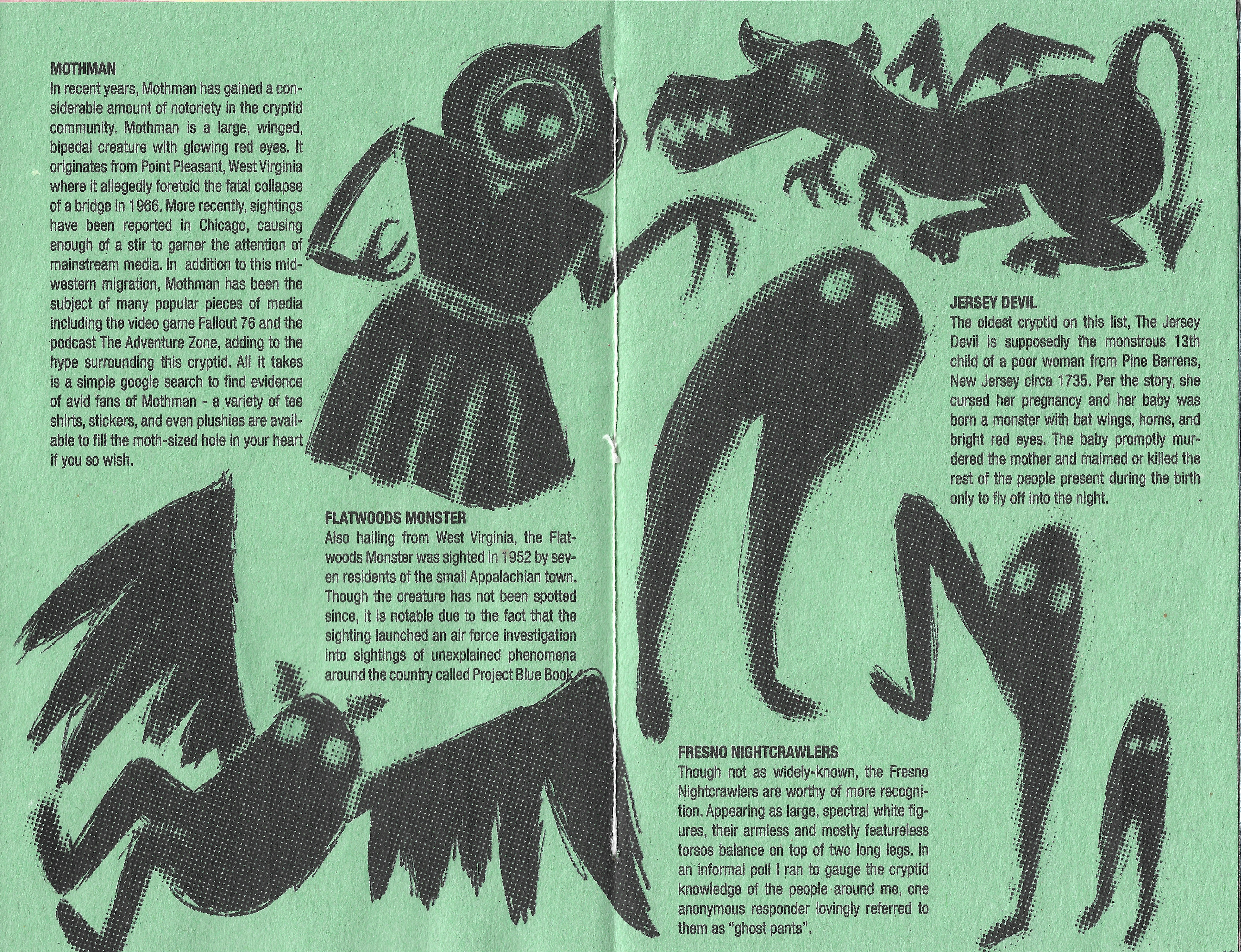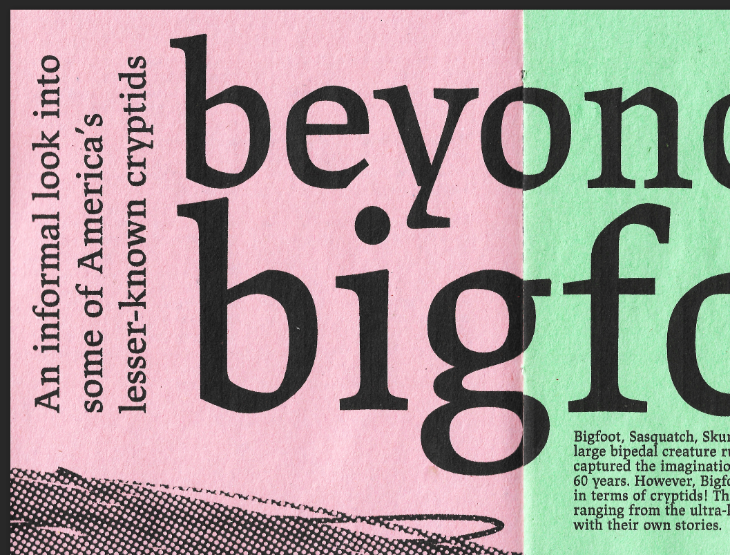 Cryptozoo is a zine made using all original content sourced from me and my friends on the topic of cryptids. Cryptids are creatures like bigfoot or the loch ness monster that are rumored to exist but have never been proven to be real. I printed it on multicolored construction paper and bound it using saddle stitching. I used invisible ink to create another level of detail and to maintain the spooky & fun tone.
