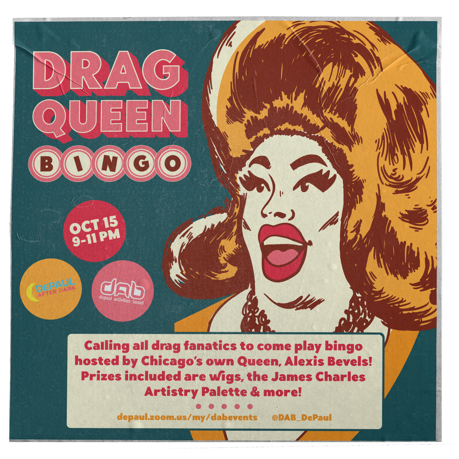 My design for the activity board's drag bingo night won Best in Show and first place in student posters at the ACUI Region V Graphics Contest 2020.