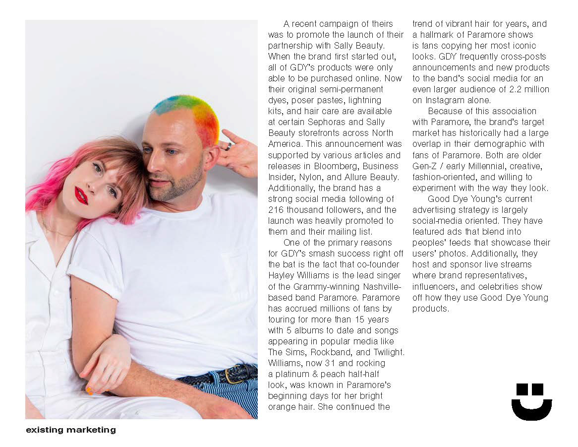 I chose hair dye brand Good Dye Young because I'm a big fan both of their products and of the co-founder Hayley Williams, lead singer of Paramore.